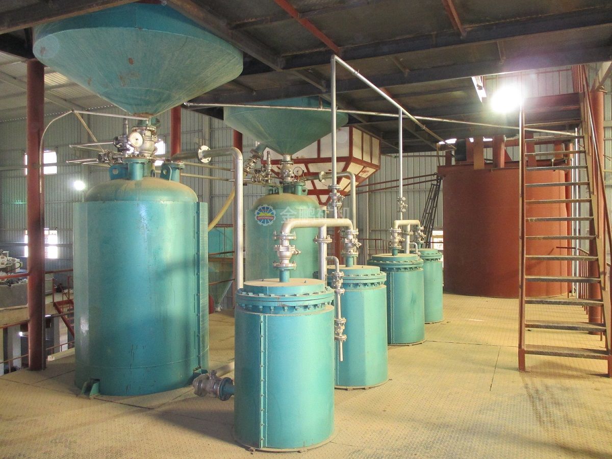 礦漿經(jīng)高效改造化濃密機(jī)濃縮,溢流流入到循環(huán)水池,底流經(jīng)膠泵打入到浸出槽,同時(shí)加入浸出藥劑,經(jīng)過(guò)兩個(gè)浸出槽的預(yù)浸再進(jìn)行活性炭吸附,活性炭加到最后的浸出槽中,按規(guī)定逐步向前面的浸出槽中運(yùn)行,當(dāng)活性炭運(yùn)行到第三個(gè)浸出槽,含金達(dá)到要求時(shí),用空氣提升器提到振動(dòng)篩進(jìn)行炭漿分離,礦漿回到浸出槽,載金炭送去解吸電解系統(tǒng)。