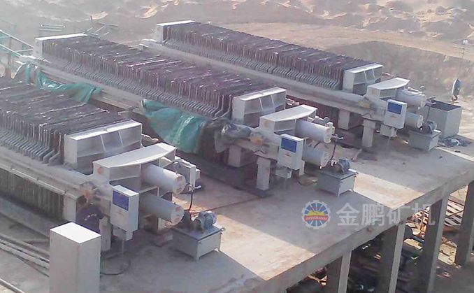 浸出槽最后的尾礦經(jīng)緩沖槽由泵輸送到全自動(dòng)廂式壓濾機(jī),壓濾后的水流入循環(huán)水池以備循環(huán)利用,濾餅經(jīng)帶運(yùn)輸機(jī)運(yùn)到尾礦堆場(chǎng),卡車(chē)將尾礦運(yùn)到尾礦庫(kù)。